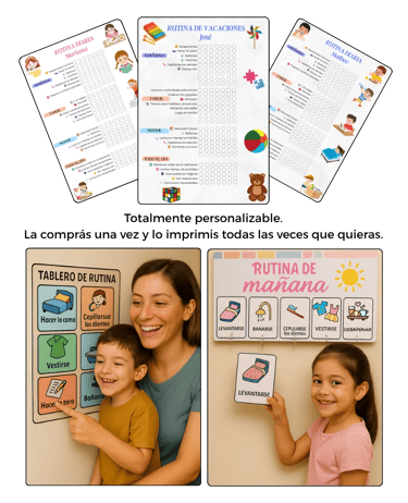 Es simple: usás rutinas visuales con imágenes claras que los niños entienden al instante. Ellos ven qué toca hacer (vestirse, lavarse los dientes, etc.), y lo hacen solos.